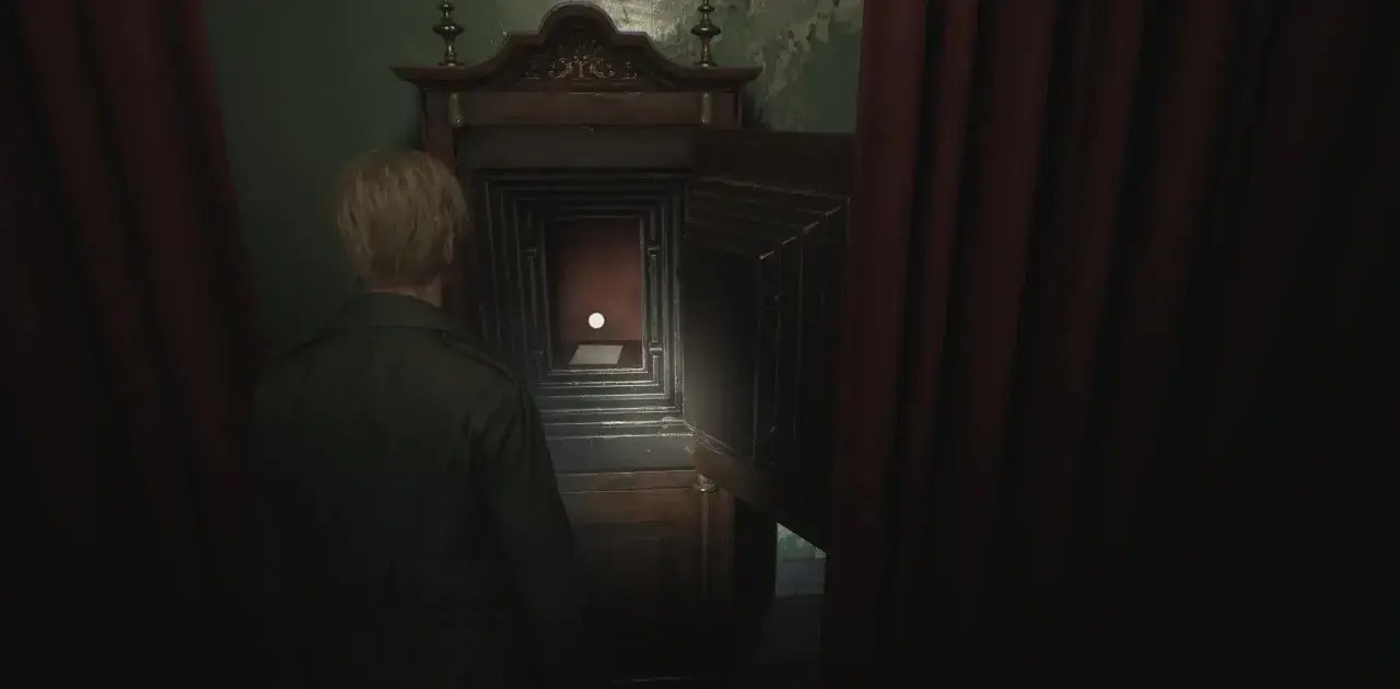 After claiming your reward, exit into the corridor and call the Elevator to go up to floor 2F. Approach the portrait/statue near the Chained Box’s former location and place both the Copper Ring and Lead Ring on it. The statue will transform into a door, swinging open to reveal the way forward for James and Maria. As you progress, you’ll find the Ominous Note on the floor.